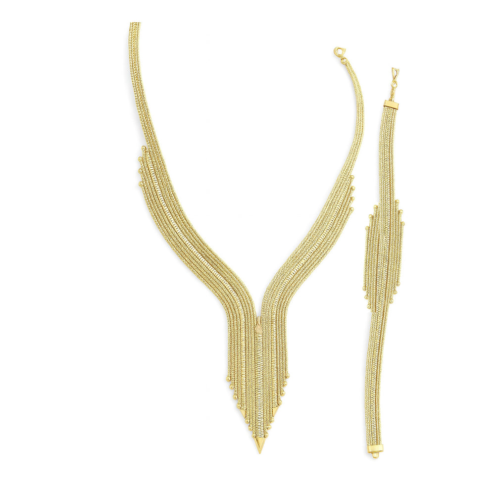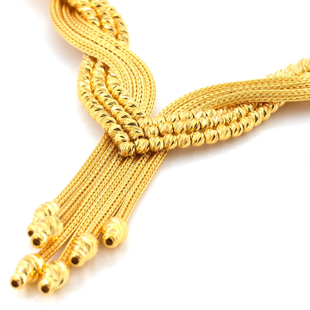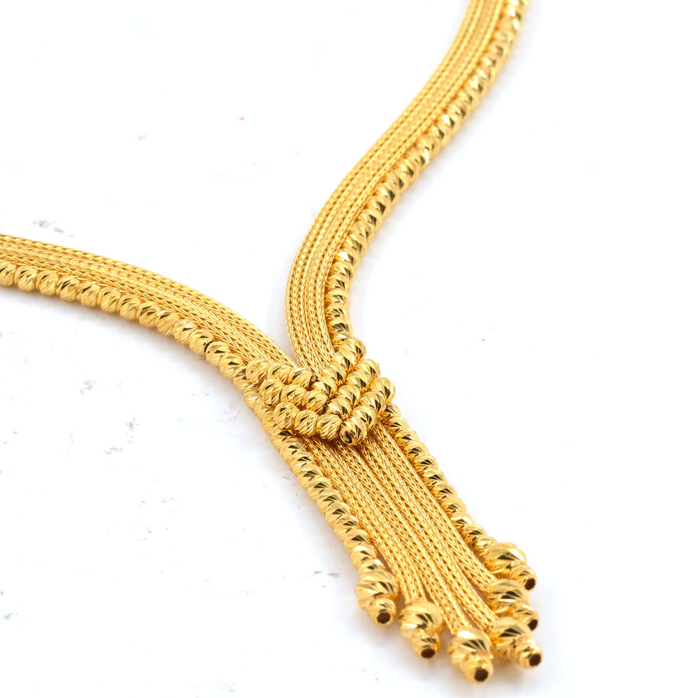 İtalyan modeller gerdanı tamamen süsleyen dikkat çekici parçalardır. El işçiliğinin ön planda olduğu bu modelde yukarıdan aşağı doğru genişleyen örgü detayları dikkat çeker. Kolyenin en ucunda ise dorika altın toplarla süslü püsküller bulunur.
