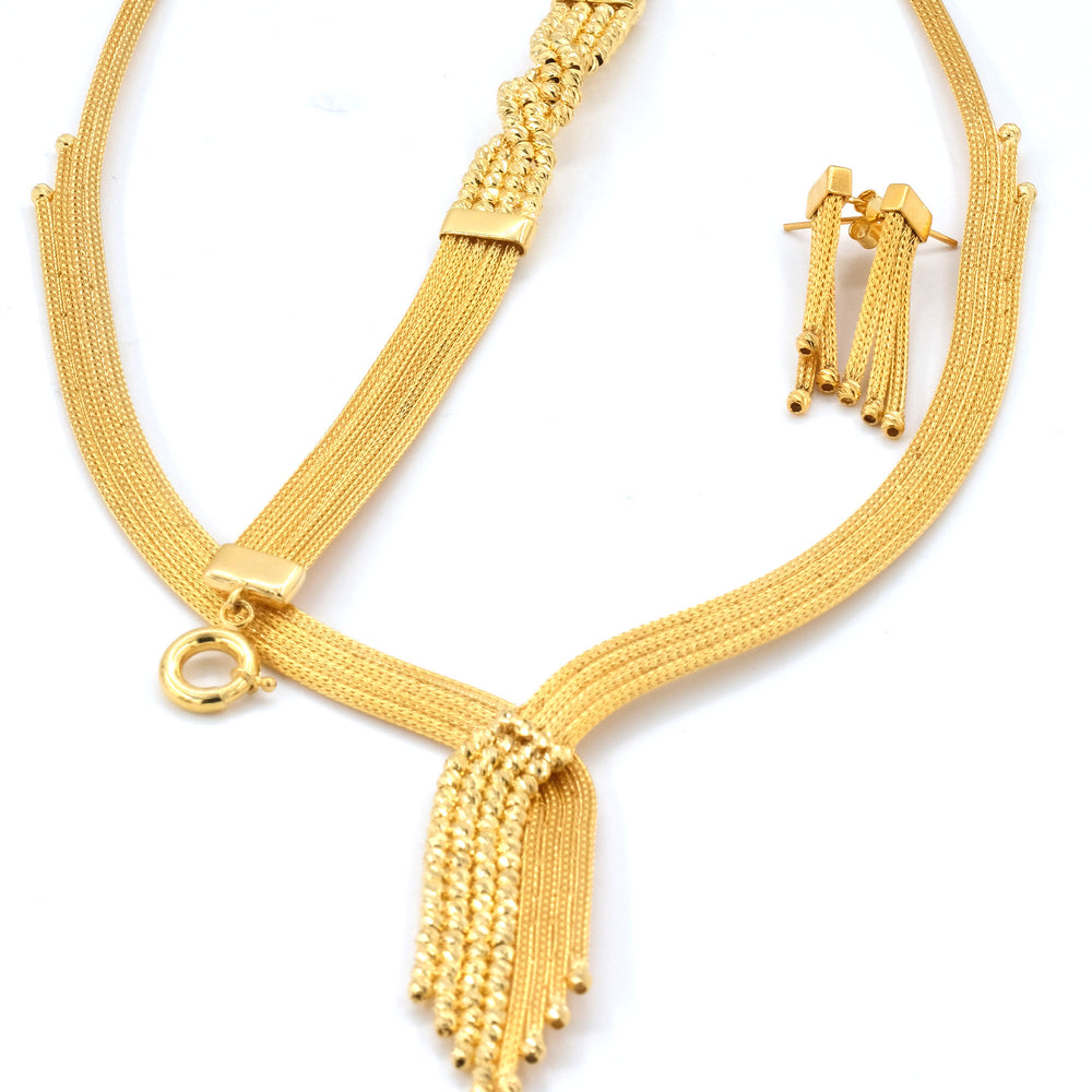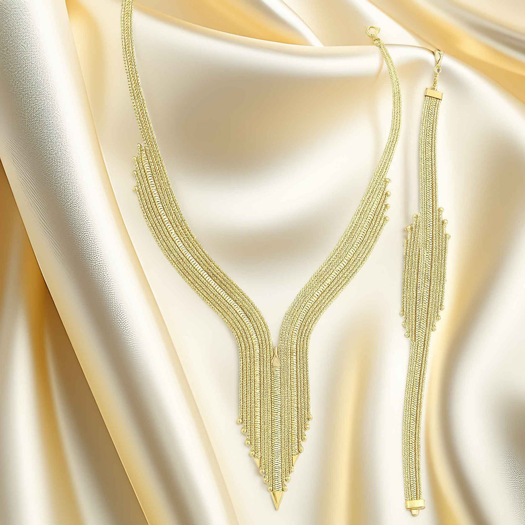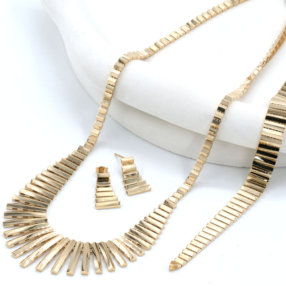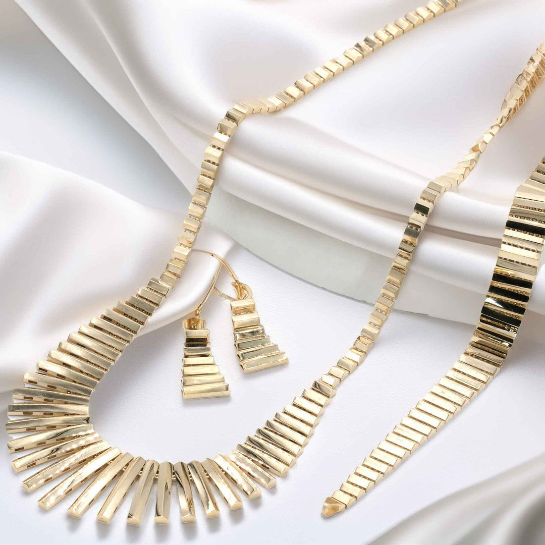 Set içerisinde bir adet bileklik, gerdanlık ve küpe takımı bulunur. Tüm parçalarda aynı model ve işçiliğin kullanılması takımdaki uyumluluğu artırır. Altın düğün seti seçenekleri arasında öne çıkan su yolu modelinde tüm parçalar 14 ayar altınla hazırlanır.