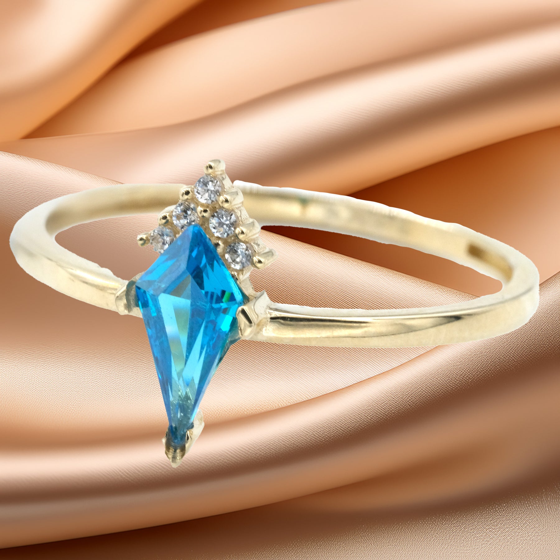 14 ayar altından ustalıkla üretilmiş bu üçgen baget yüzük, geometrik hatları ve parlayan baget taşıyla modern zarafeti temsil eder. Günün her anında şıklığınızı tamamlayan bu özel tasarım, minimal detaylarıyla göz alıcı bir duruş sergiler.